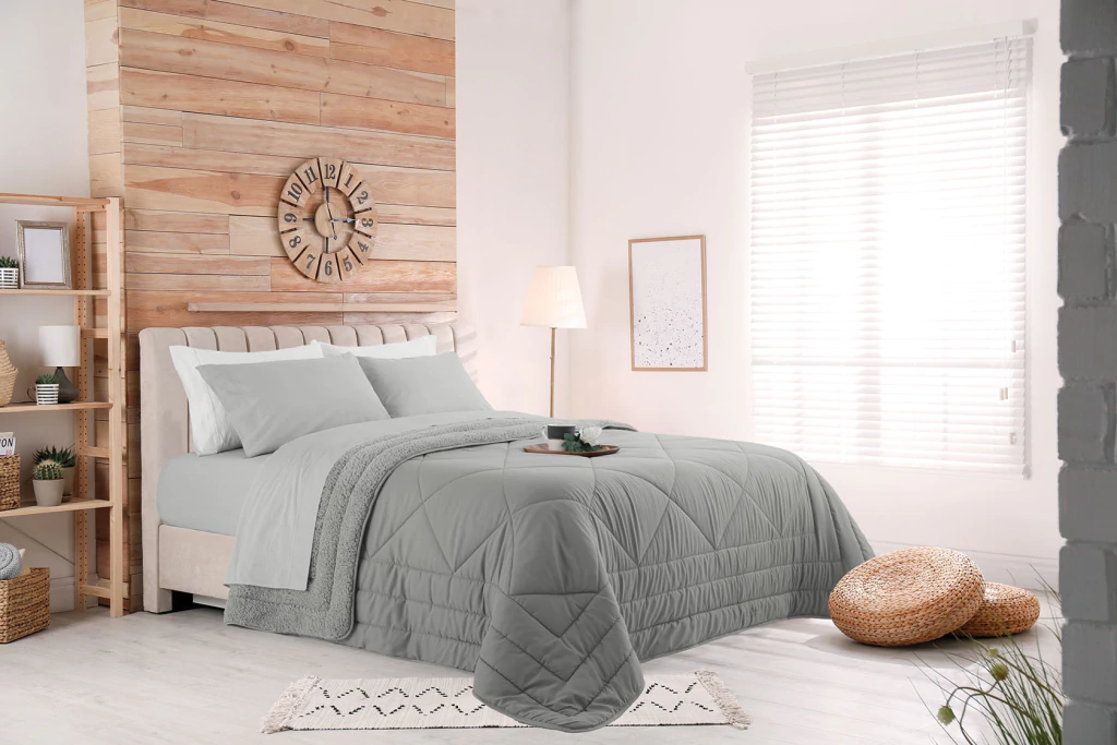 Microfibra premium de tacto algodonoso por fuera. Relleno liviano de guata que abraza sin abrumar. Reverso de corderito al tono que invita a acurrucarse. Un acolchado pensado para quienes quieren presencia y confort en la cama.